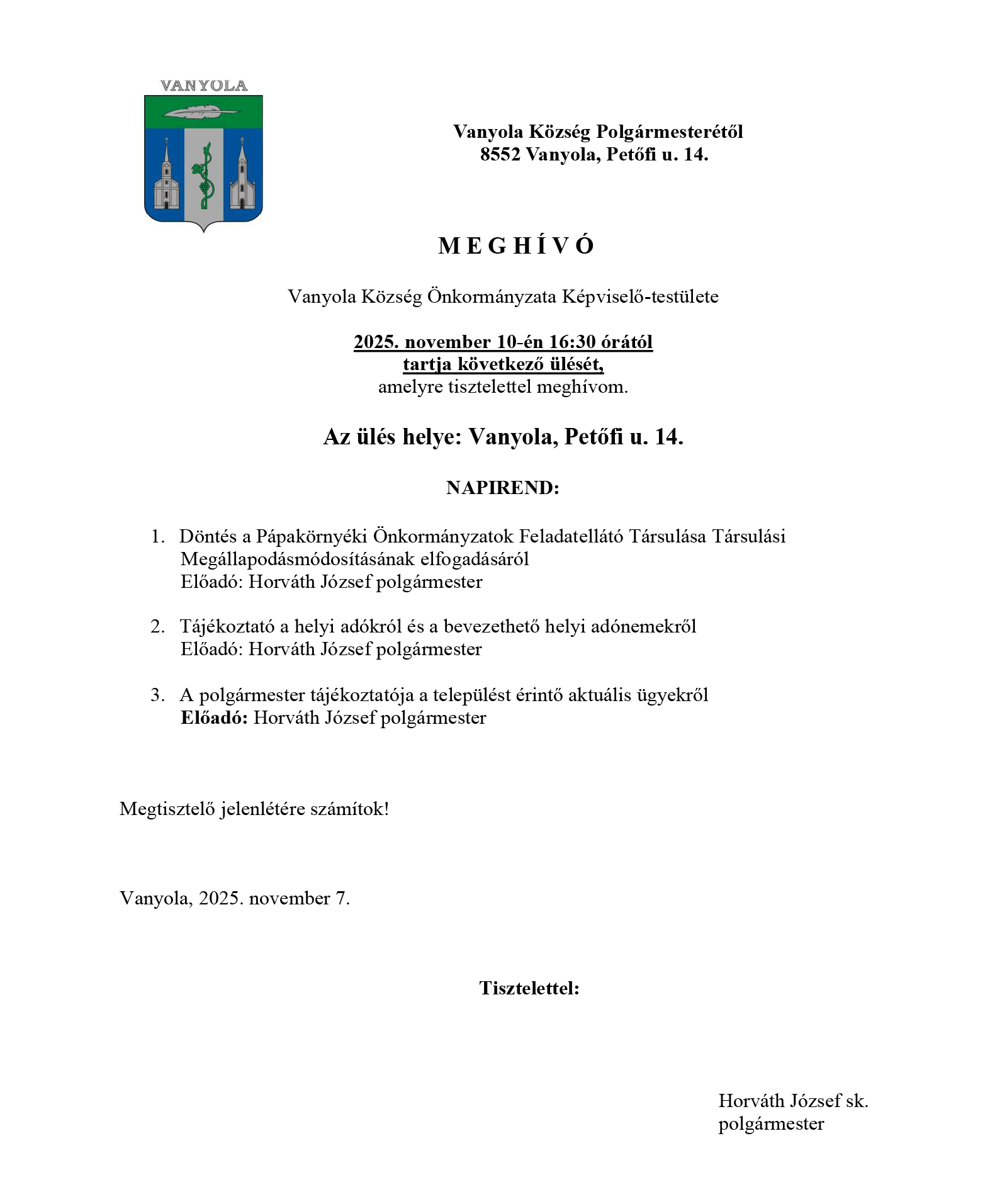 Az ülés helye: Vanyola, Petőfi u. 14. Polgármesteri Hivatal