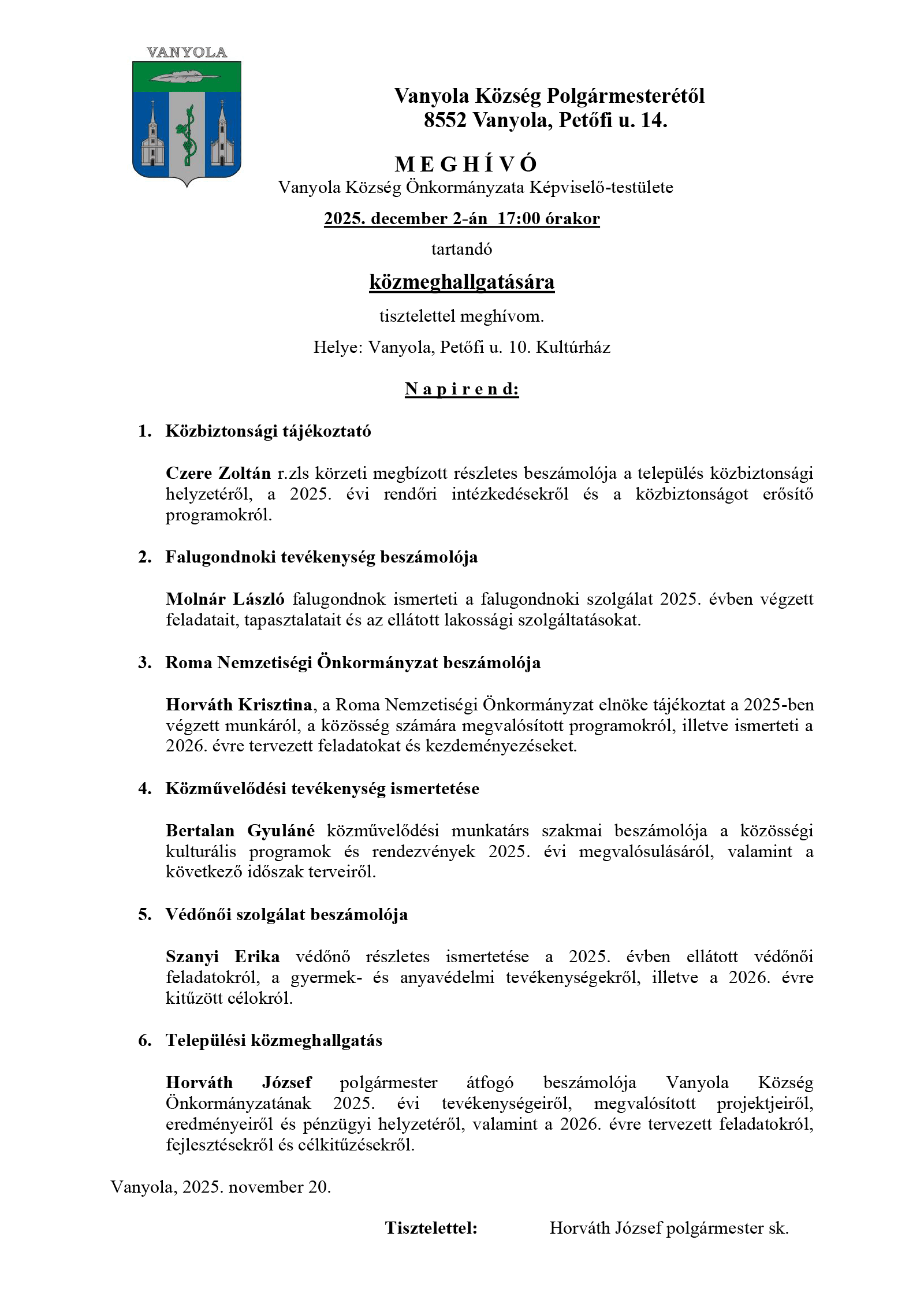 Az ülés helye: Vanyola, Petőfi u. 14. Polgármesteri Hivatal